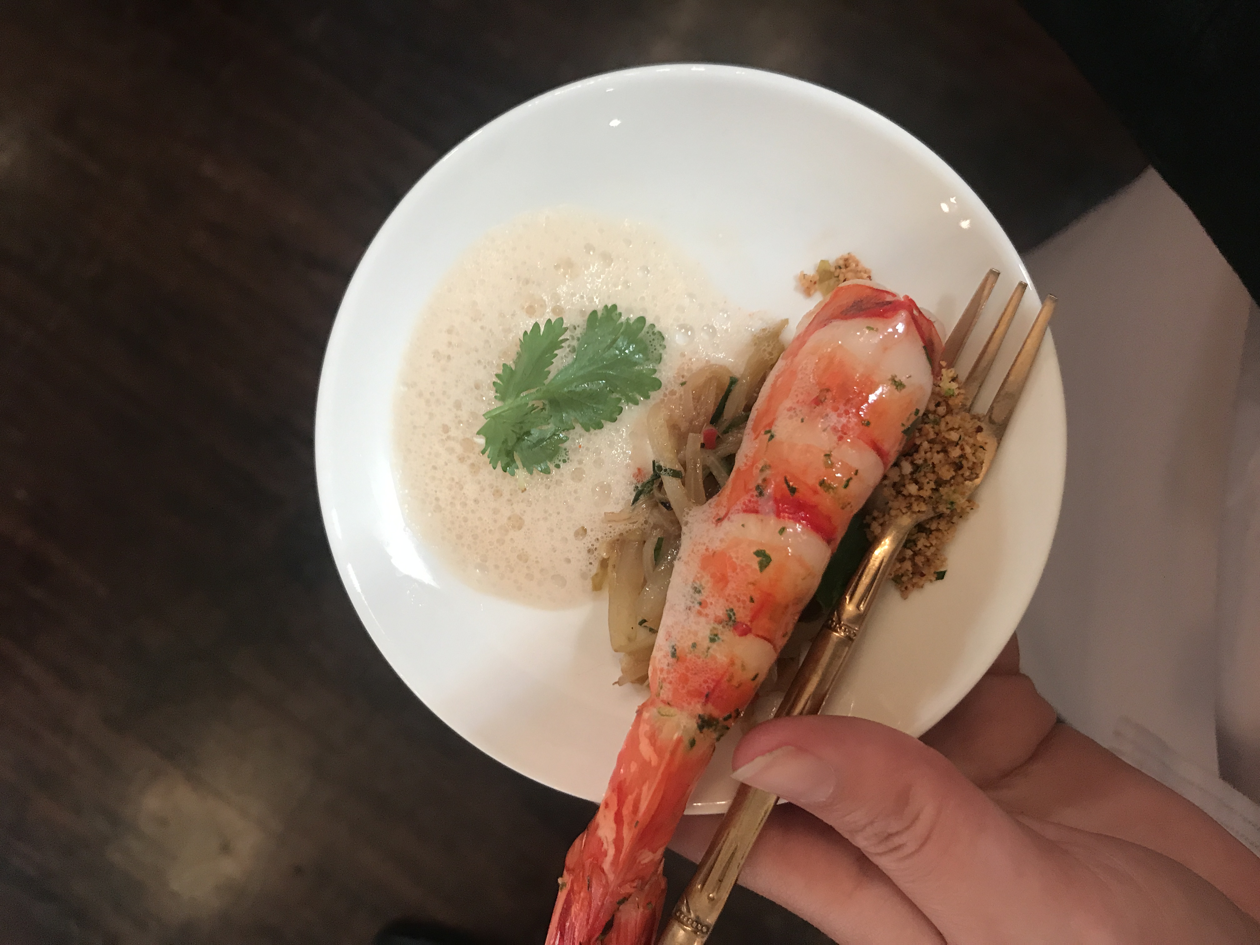 Tweede hoofdgerecht door Bram Heylens & Tarudee Sriwilasak : salade van gesauteerd witloof met chili, kaffirblaadjes en galangal, in kaffir gemarineerde Thaise zoetwatergarnaal met schuim van bisque met geuze van Oud Beersel, crumble van pecannoot, kafir en chili