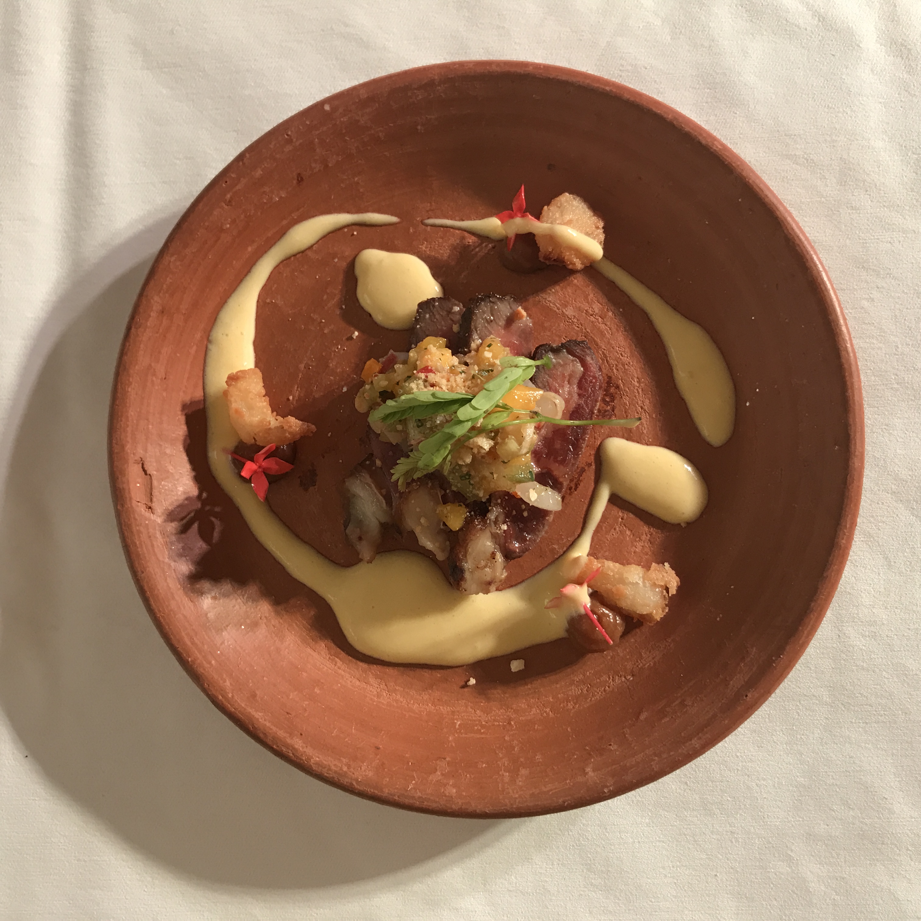 Eerste hoofdgerecht door Anthony Snoeck & Chom Pasidparchya: entrecôte à la minute bereid met bieranaise van blonde Leffe, Thaise salsa, crème van tamarinde en verse tamarinde blaadjes.
