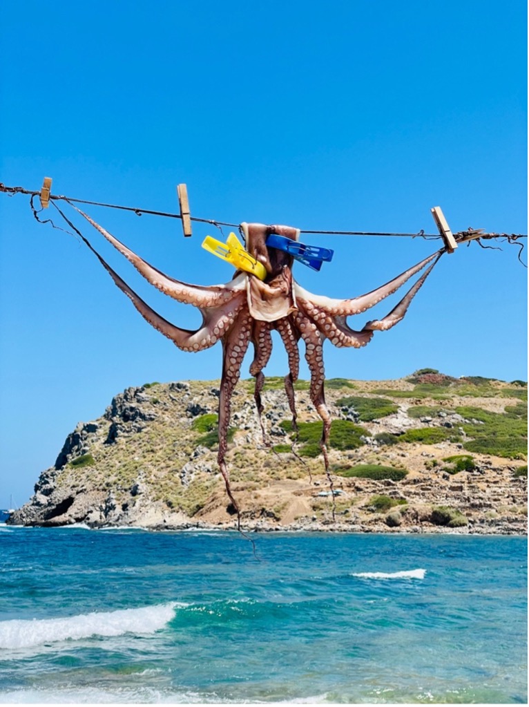 Een typisch straatbeeld op Kreta: octopus die te drogen hangt aan een draad. Het lijkt misschien decoratief, maar het is pure functionaliteit. De taaie vezels in de octopus worden zo zachter, wat zorgt voor een malser en smaakvoller gerecht. Geen zorgen dus, het hoort zo – en het smaakt fantastisch.