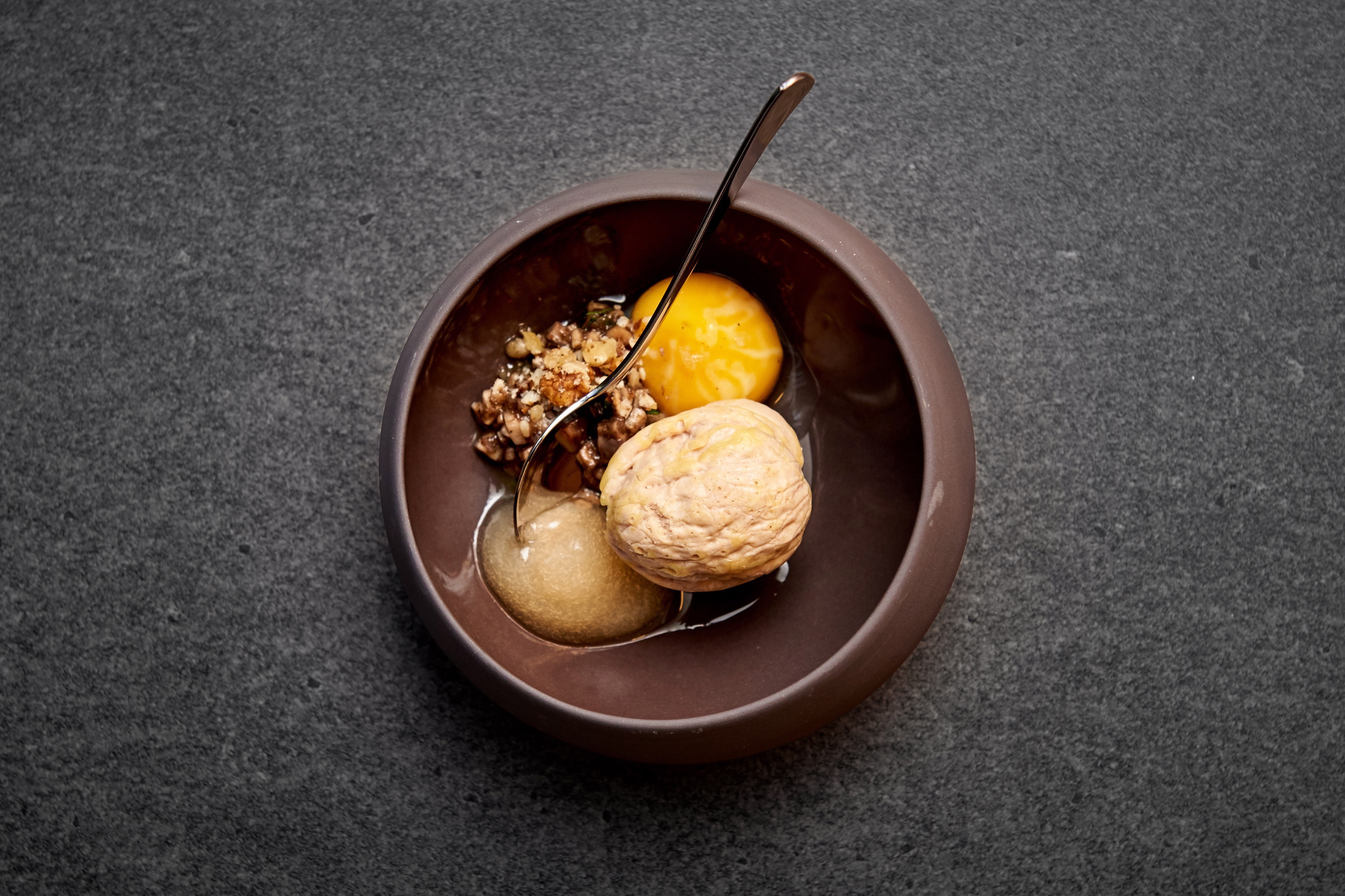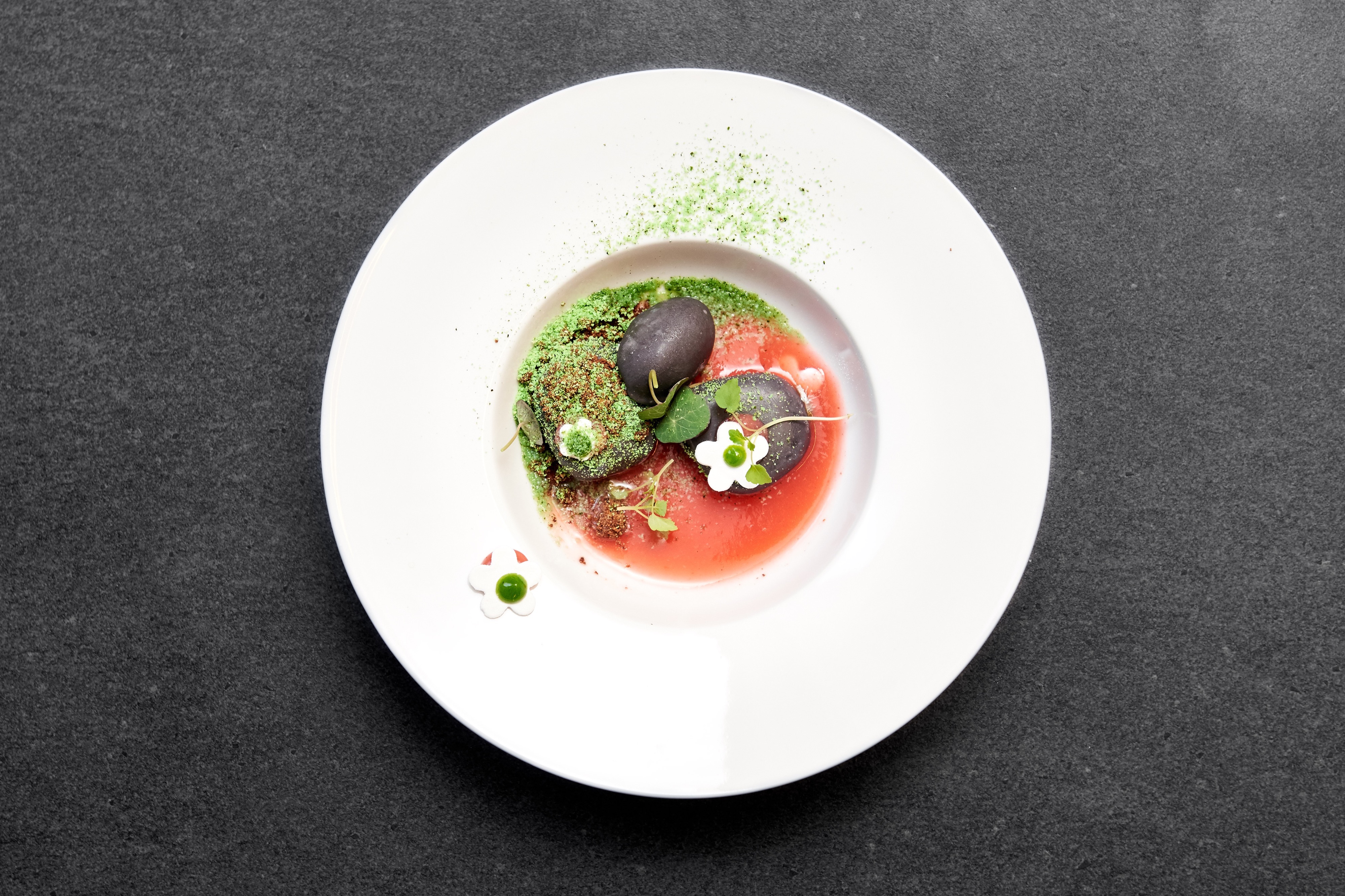 - Chocoladesigaar/gerookt as & chocoladekei/perziksoep/atsina van Ô De Vie